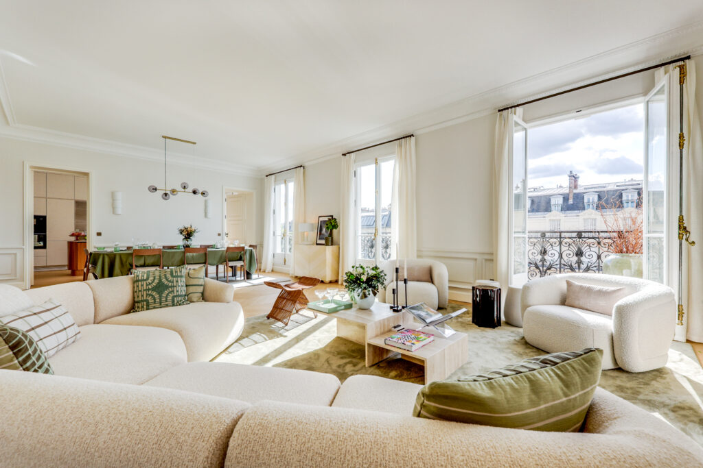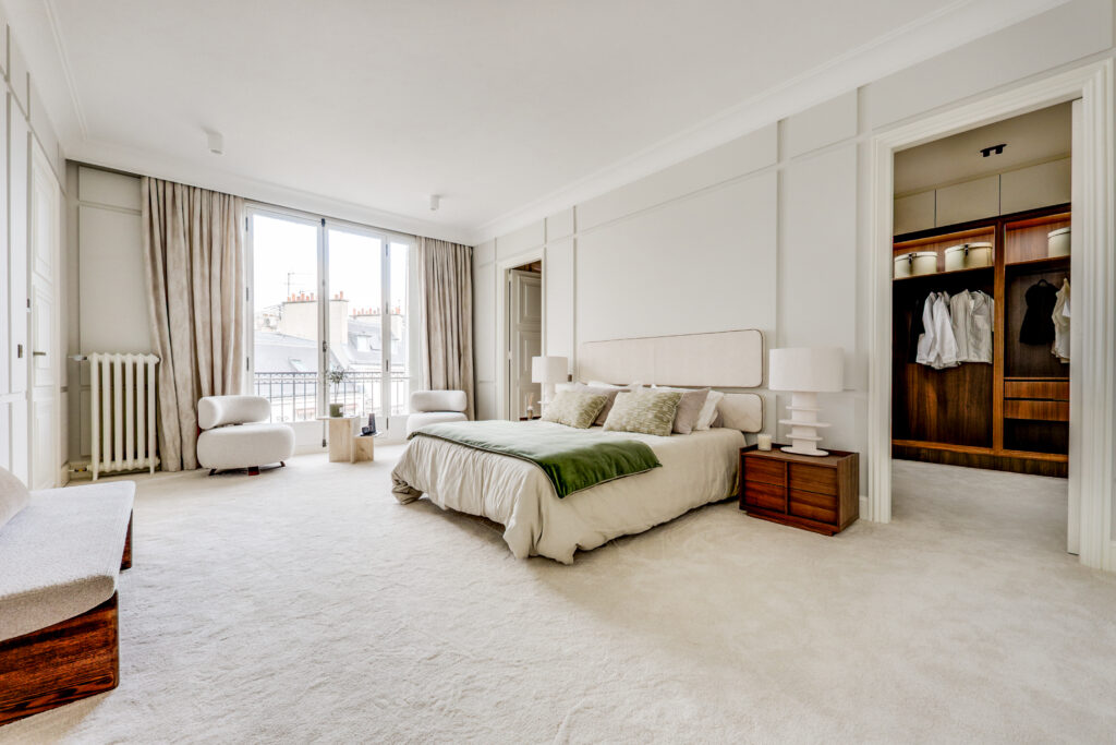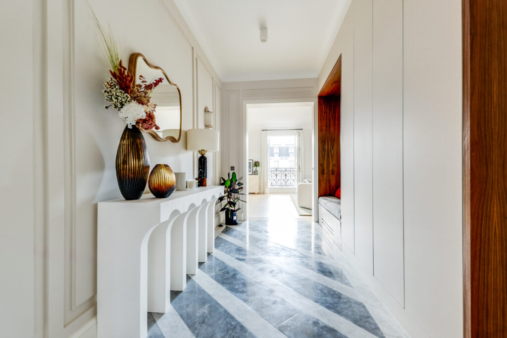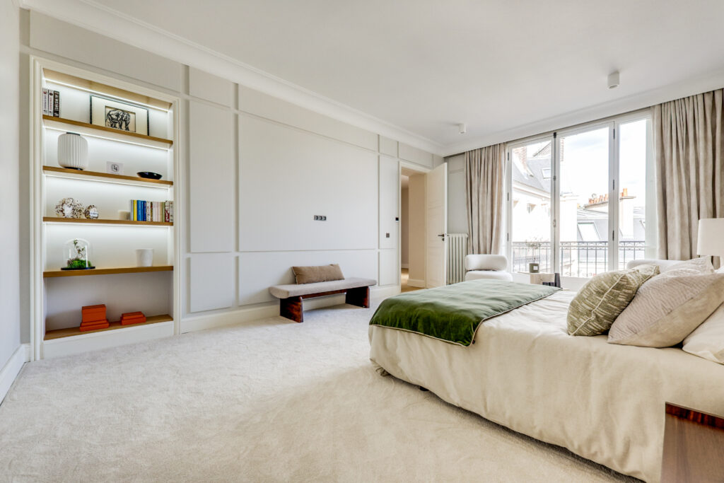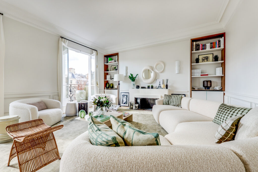 - Une élégante galerie d’entrée Une vaste réception de 55 m² de plain-pied, prolongée par un balcon exposé sud-ouest, offrant une vue exceptionnelle sur la Tour Eiffel, le Pont de l’Alma et la Seine