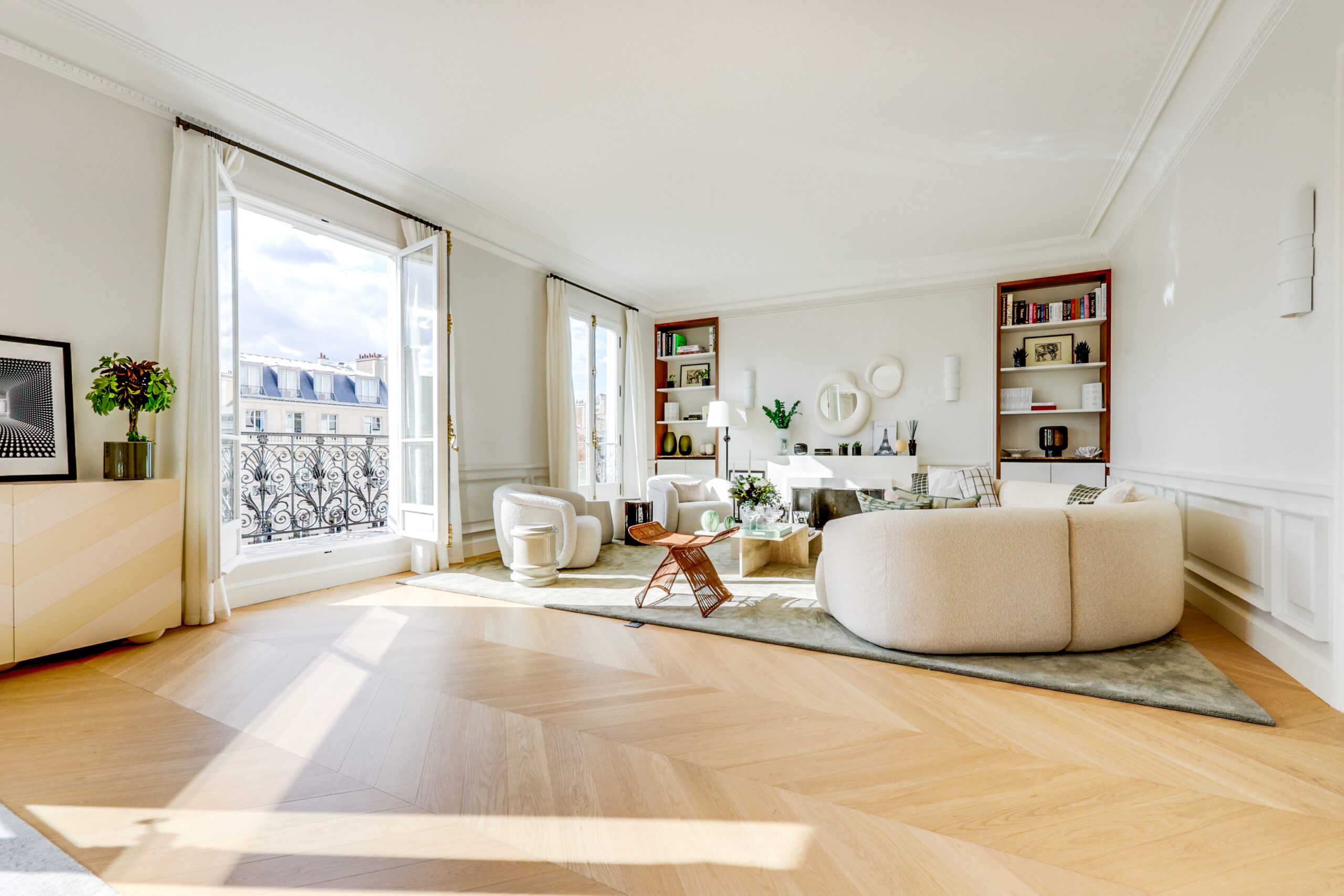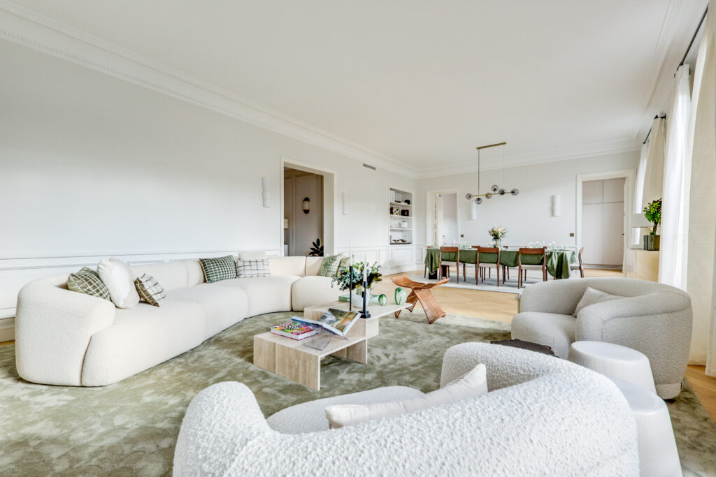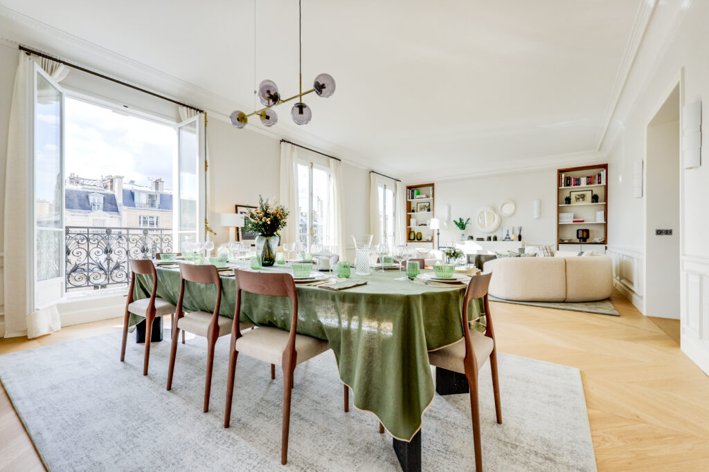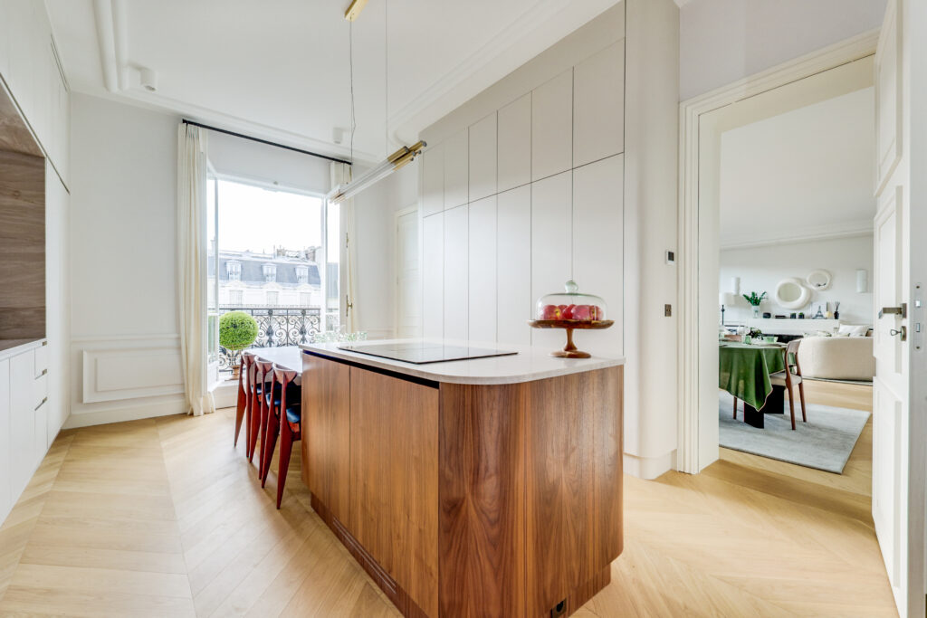 - Une élégante galerie d’entrée Une vaste réception de 55 m² de plain-pied, prolongée par un balcon exposé sud-ouest, offrant une vue exceptionnelle sur la Tour Eiffel, le Pont de l’Alma et la Seine